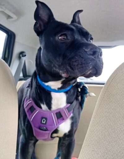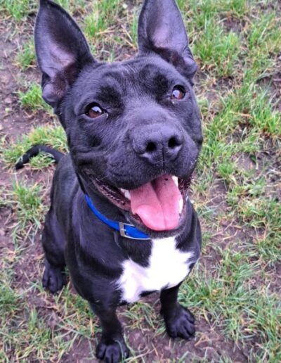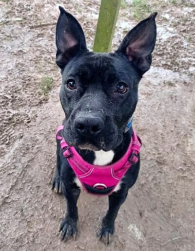 C’est une louloute pleine de vie, ce qui rend l’enfermement difficile à supporter pour elle. Lorsque quelqu’un passe devant son box, elle essaie d’attirer l’attention en montrant ses talents de saut en hauteur…! 😅.
